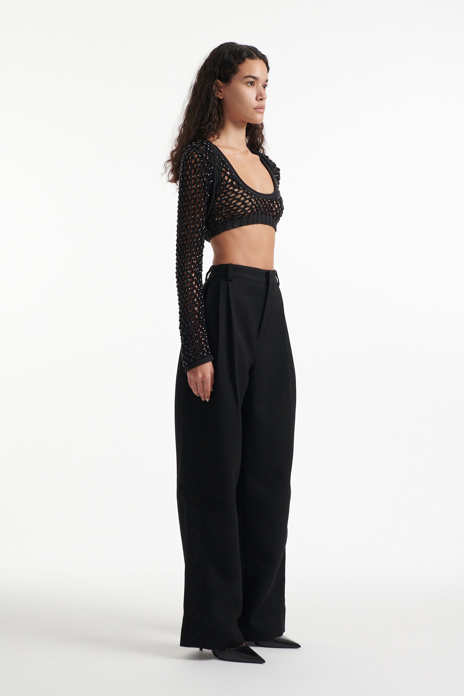 Long high-waisted trouser with embroidered diamond detailing along outside panel on either leg.