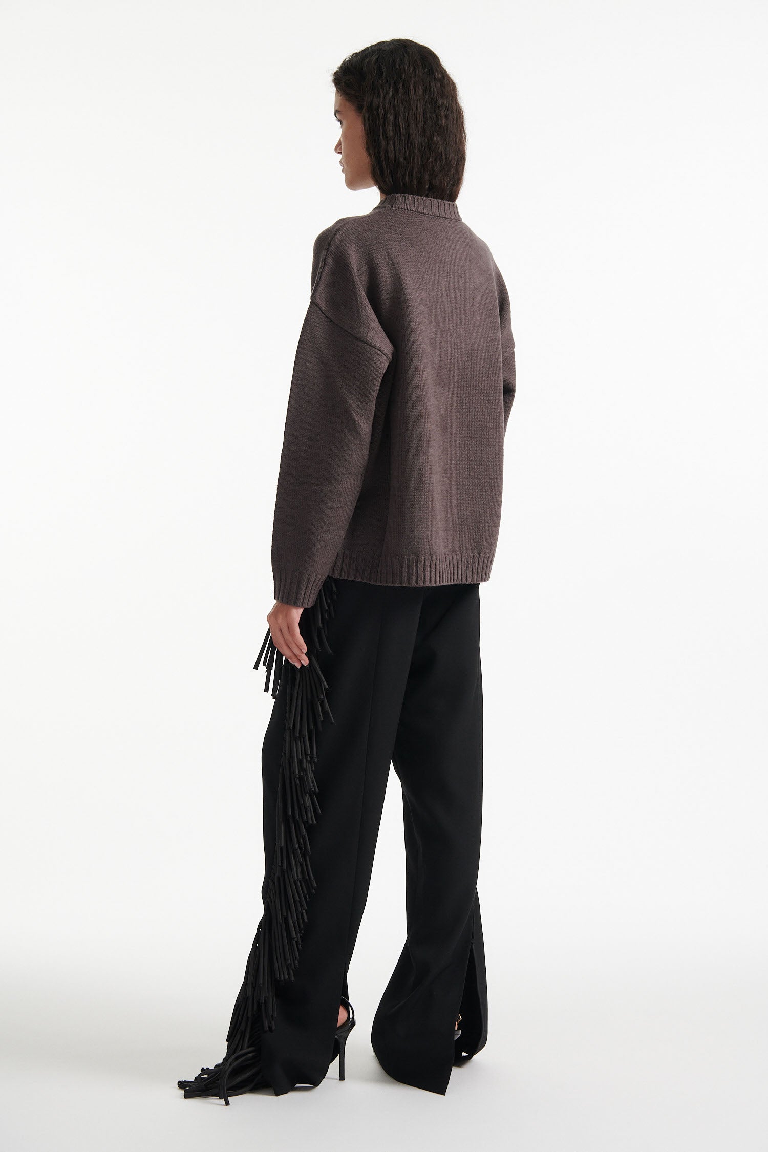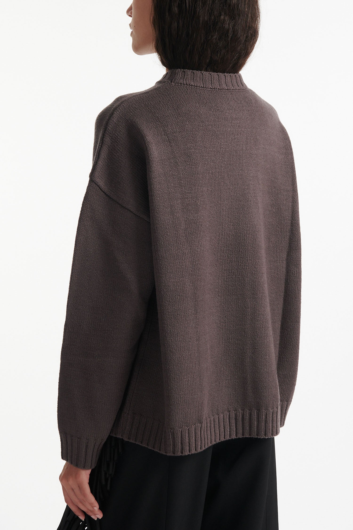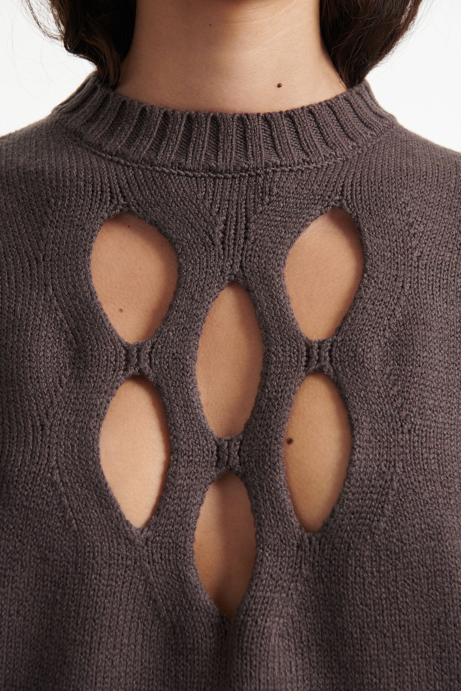 Rib-knit sweater with intarsia cutout detail at center of the chest.