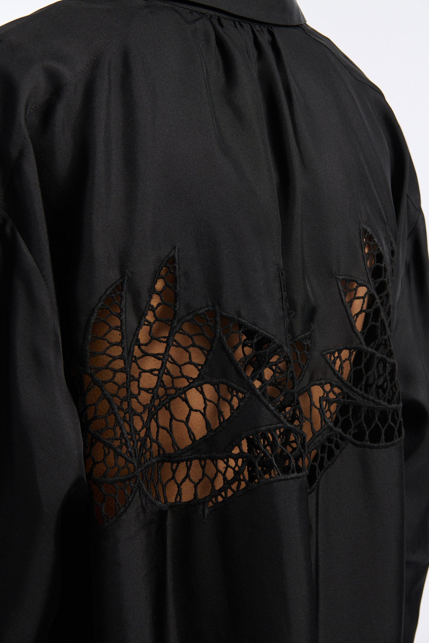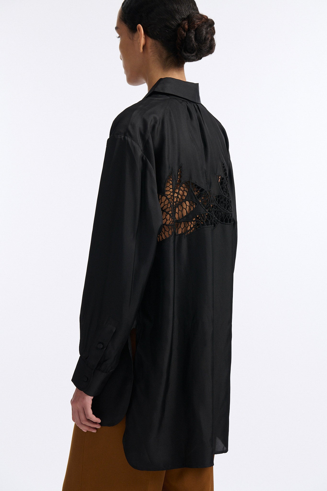Long curved-hem silk shirt with broderie anglaise at chest and back.